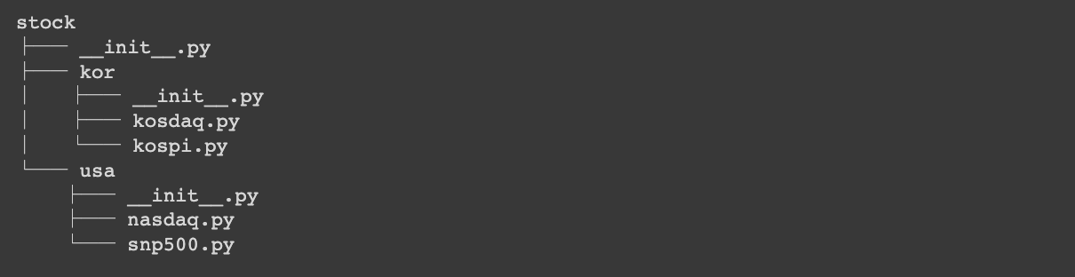 각각 kor 그리고 usa 폴더 밑에 생성한 __init__.py는 패키지에 있는 디렉토리의 모듈을 설정하는 파일입니다.