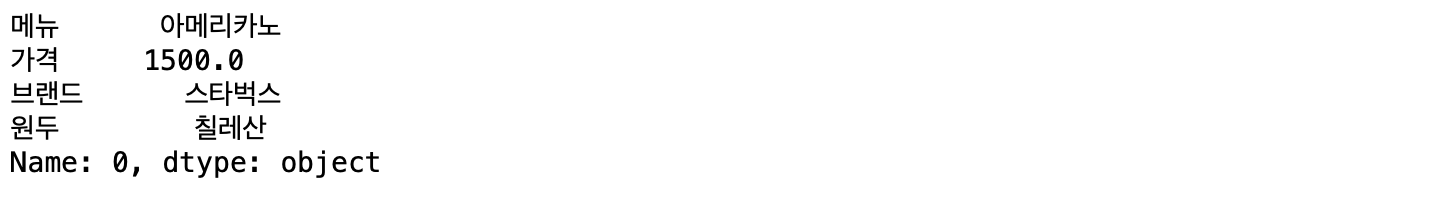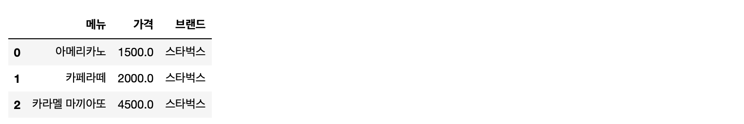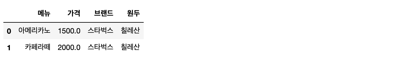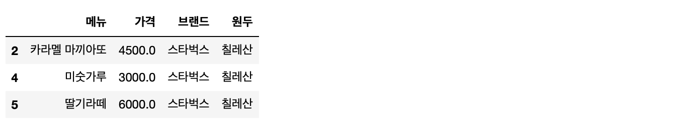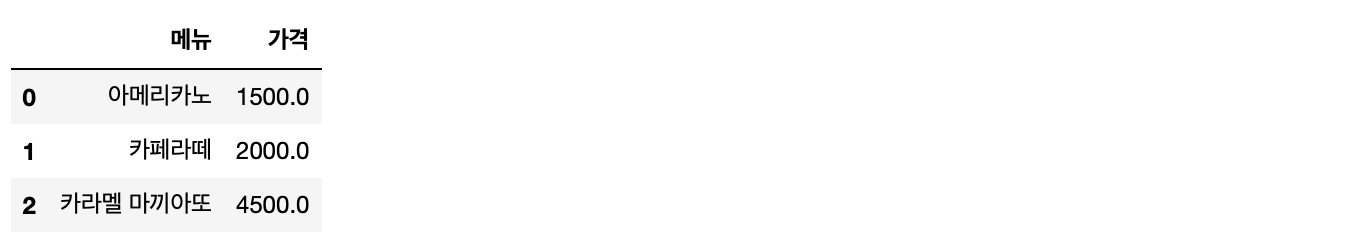 cafe.loc[[0,1,2], ["메뉴", "가격"]] #1~3번째 행 데이터의 메뉴와 가격