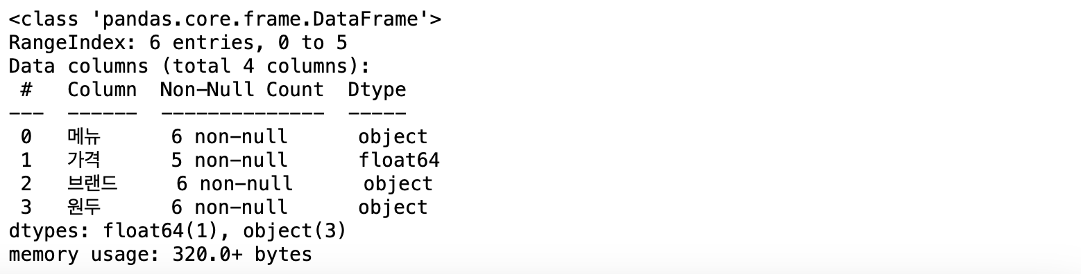 DataFrame의 기본적인 정보를 알려고 하면 info 함수를 사용하면 column 종류, 데이터타입, 개수