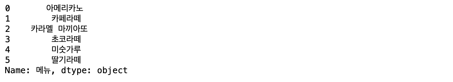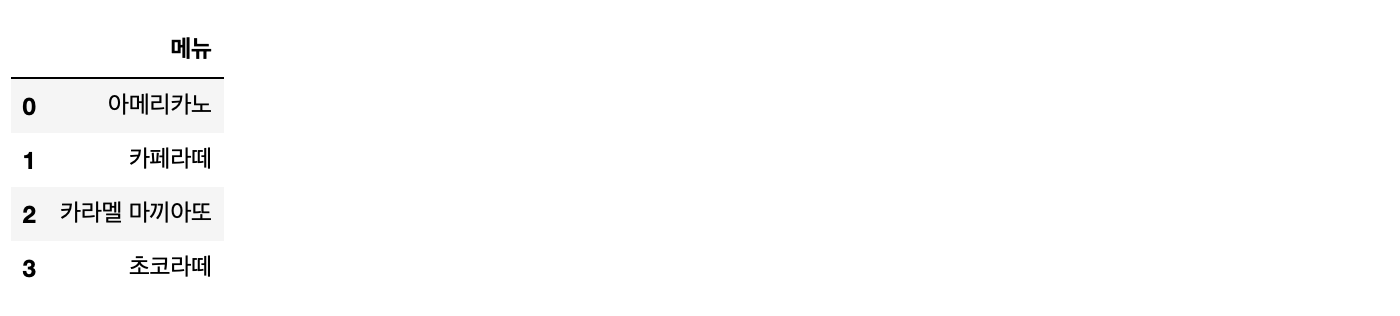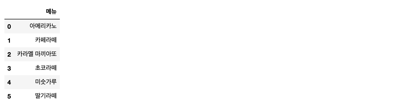 df['메뉴'] = ["아메리카노", "카페라떼", "카라멜 마끼아또", "초코라떼", "미숫가루", "딸기라떼"]