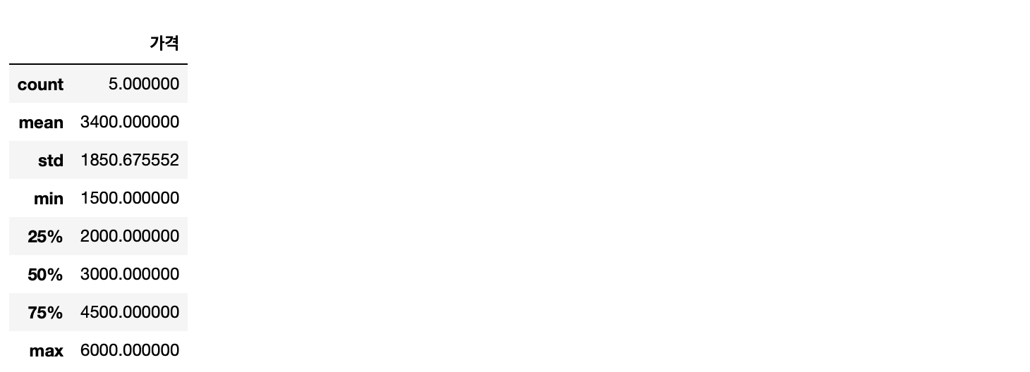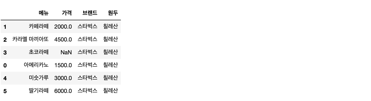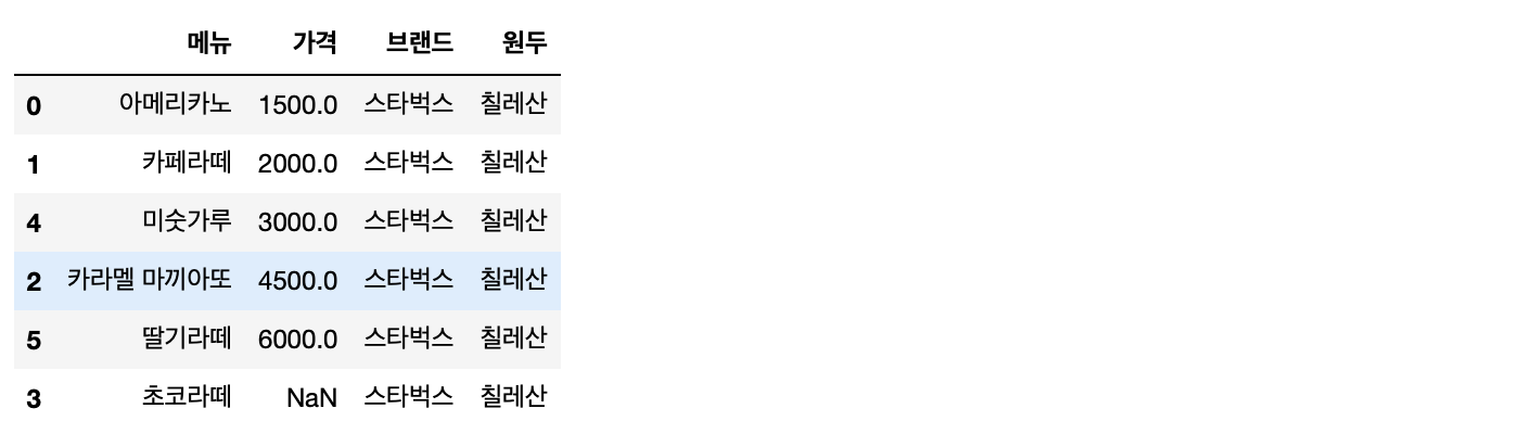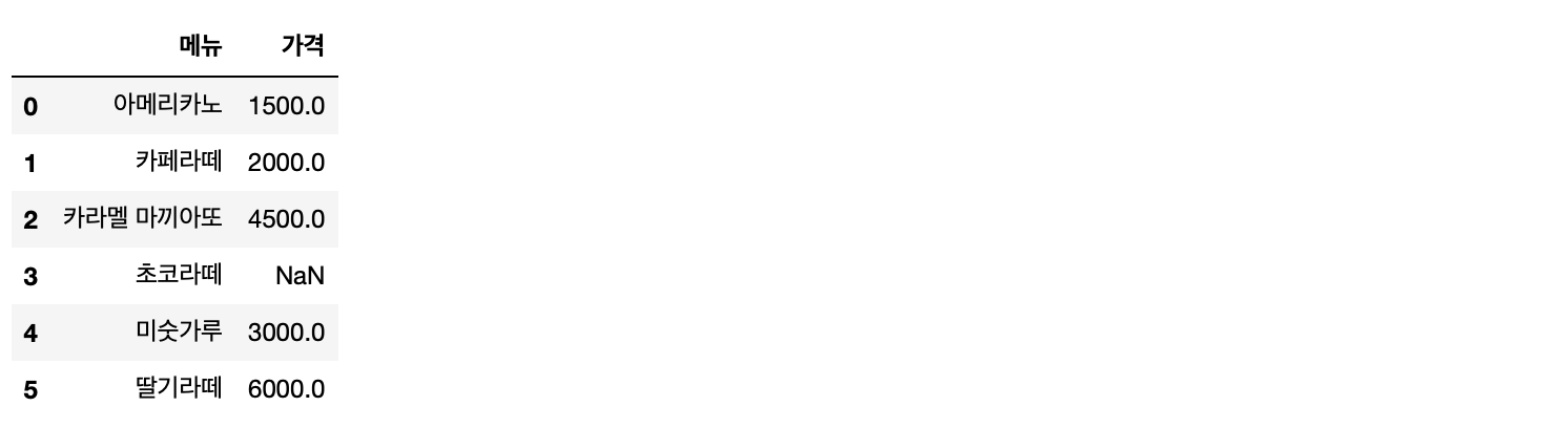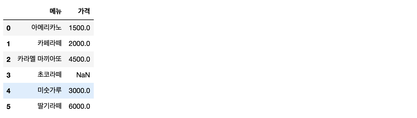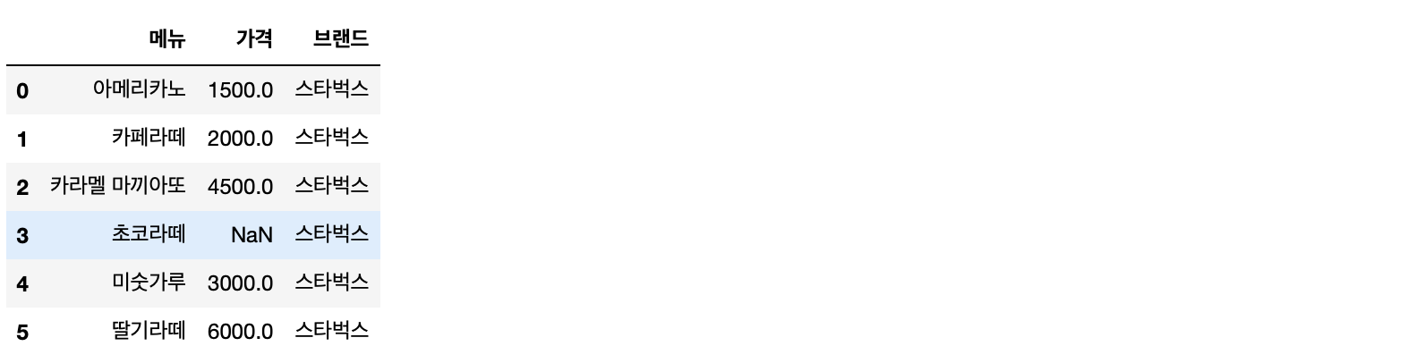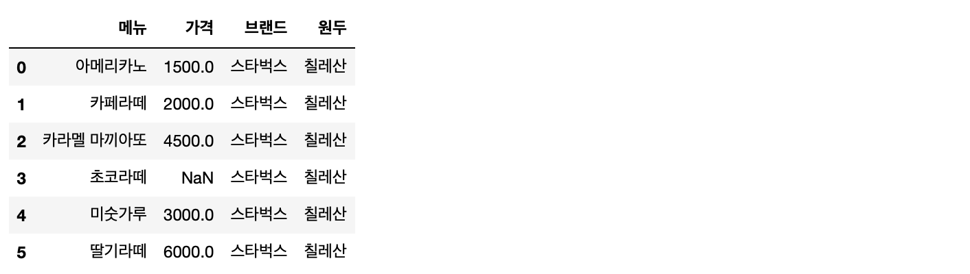 cafe["가격"] = [1500, 2000, 4500, np.nan, 3000, 6000]