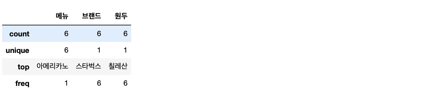 cafe.describe(include = 'object') #범주형 데이터의 경우 소괄호 안에 include = 'object'을 기입해줍니다.