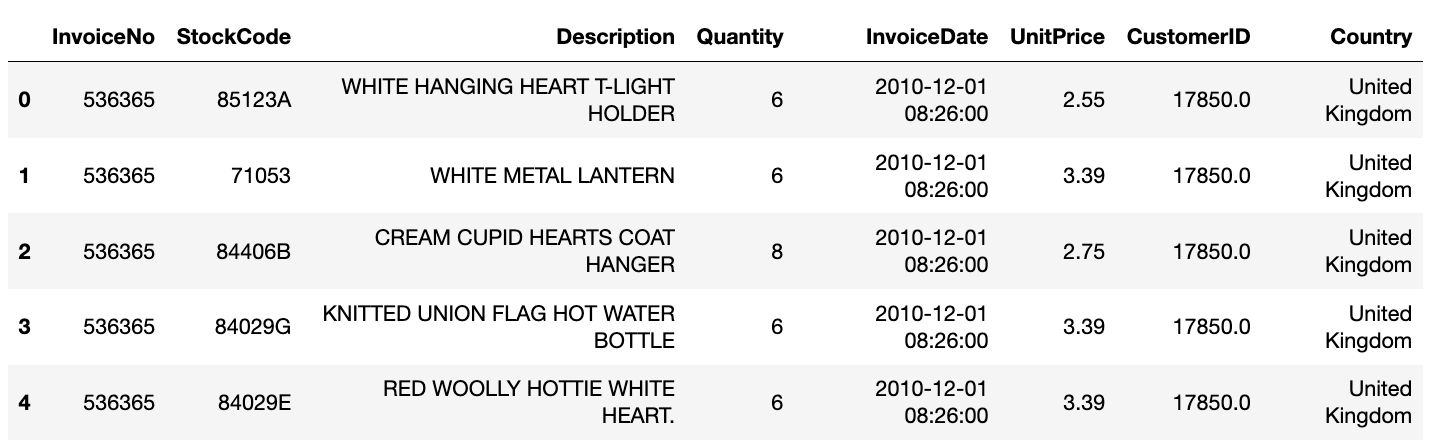 코호트 분석에서 잔존율을 구할 때 저는 위의 데이터를 사용했습니다. 이 때 필요한 column은 InvoiceDate(주문일자)와 CustomerID(고객번호)입니다. 판다스에서 groupby를 사용해 CustomerId로 묶고 count를 사용하면 일별 횟수를 구할 수 있습니다.